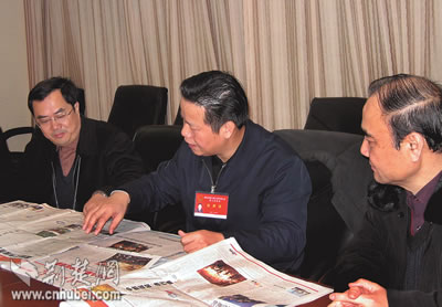 “今年的‘兩會(huì)’報(bào)道有新意,有創(chuàng)意,圖文并茂,紙網(wǎng)互動(dòng),為今年的宣傳工作贏得了‘開(kāi)門紅’,打響了‘第一炮’!弊蛉障挛纾∥N、宣傳部部長(zhǎng)張昌爾到洪山賓館看望了“兩會(huì)”宣傳報(bào)道人員,對(duì)本報(bào)的“兩會(huì)”報(bào)道充分肯定。