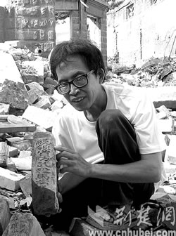 近日,武昌民間磚瓦收藏家劉文斌(上圖)在黃鶴樓下先賢街發(fā)現(xiàn)了一塊古磚,磚側(cè)一行銘文“統(tǒng)領(lǐng)省防武毅馬步□”字樣(下圖)。據(jù)研究武昌城民間文史考古家王昌旺考證,明代軍事建制在《明史》中均可查,然而有實(shí)物、遺址的證實(shí)卻不多。這塊明代古磚是武昌楚王府拱衛(wèi)軍高級指揮機(jī)關(guān)的遺物,對研究楚王府的“府兵制”起到了實(shí)物佐證作用。