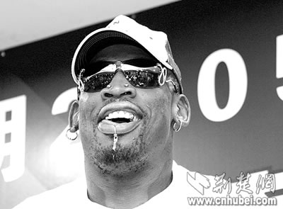 七分鐘后,前NBA巨星羅德曼出現(xiàn)在人們的視野里。他顯得有些疲倦,白色球帽遮住了那大半個五顏六色的后腦勺,不過那張有些冷酷的臉,還是讓人很快認出,這就是那個我行我素的“大蟲”羅德曼。