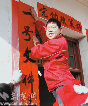 稅費改革后的漢川農(nóng)民興高采烈貼對聯(lián)。本報記者王成鋼攝