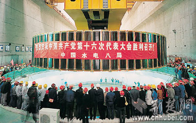 今年8月1日,三峽左岸電廠的最后一臺(tái)發(fā)電機(jī)組轉(zhuǎn)子吊入機(jī)坑(圖二)。令三峽建設(shè)者們感到自豪的是,這同樣是世界上最大的發(fā)電機(jī)組,不同的是其零部件國(guó)產(chǎn)化程度達(dá)到85%。