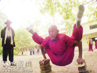 昨日,由武漢市體育局主辦的首屆體育廟會在武漢市青少年宮開幕。各種中國傳統(tǒng)體育項目紛紛登場初賽、表演。尤其是一些絕技絕活,如心房頂戟、后腦斷磚、朝天蹬、九節(jié)神鞭等,驚險刺激,令觀者嘖嘖稱奇。記者劉大家、胡彩麗攝影報道