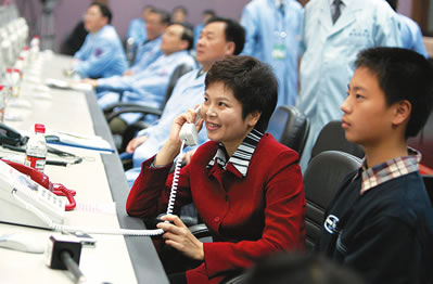 12日21時(shí)34分,正在神舟六號(hào)飛船返回艙內(nèi)的航天員費(fèi)俊龍和聶海勝與北京航天飛控中心指控大廳內(nèi)的家人進(jìn)行天地通話(huà)。