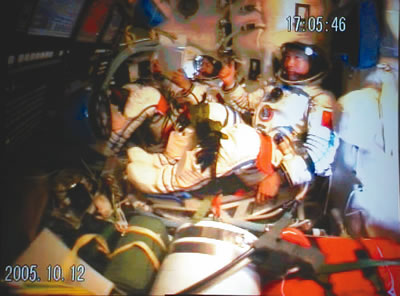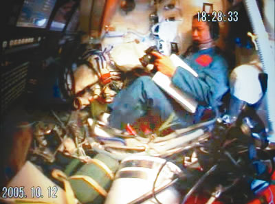 17時(shí)29分,航天員向地面飛控中心報(bào)告飛船工作正常,已做好開(kāi)啟返回艙艙門(mén)的準(zhǔn)備。在得到地面指揮員的指令后,費(fèi)俊龍打開(kāi)返回艙艙門(mén),在聶海勝的幫助下進(jìn)入軌道艙工作。