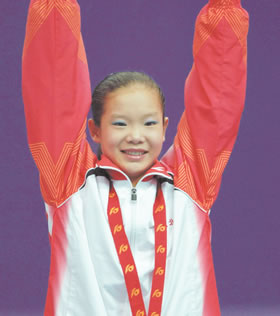 果不其然,在澎湃的音樂聲中,程菲以近乎完美的表演贏得了全場最高分——9.817分。賽后,程菲對自己的狀態(tài)和靚麗很滿意。省體操中心主任王沛笑著對記者說:“我感覺程菲像變了個(gè)人似的,有一種前所未有的自信。”一年前的程菲非常膽怯,與外界打交道時(shí)總是很沉默,王沛鼓勵(lì)她說:“你要多笑,笑起來才好看,觀眾和裁判才會喜歡你!币荒旰,程菲在金陵笑的格外甜!