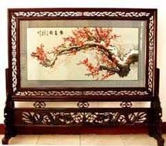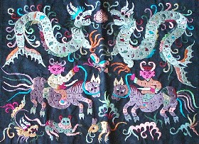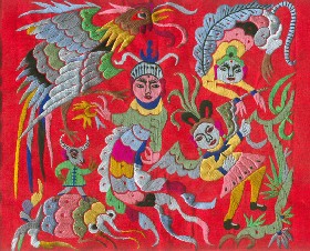 苗繡 刺繡,是苗族婦女盛裝不可或缺的飾物,主要有領(lǐng)花、肩花、襟花、背塊花、袖口花、裙鑲花、帽頂花、帽頂花等品種。苗族刺繡,整體上多為幾何構(gòu)圖,古樸多姿。其圖案因繡片條、塊的不同,分為幾何二方連續(xù)式和四方連續(xù)式構(gòu)圖。其圖案取材于生活中常見的草木、鳥獸、蟲魚、器具等。圖案的整體布局一般以菱形為立體紋樣,常見的是大菱形中套小菱形,小菱形又分別由不同色彩的方、圓、三角點(diǎn)狀組成。條狀繡片,多用點(diǎn)、線或線面組合,一整二剖構(gòu)圖。繡片是按布的經(jīng)緯戳針,故曲線多折角。大塊繡片,如背塊花等,多用菱形四方連續(xù)構(gòu)圖,并在其中布以對稱的變形幾何點(diǎn)及其他折線。所有繡片,粗看五彩斑斕,細(xì)觀則不同色線組圖分明,交錯(cuò)重疊,既復(fù)雜多變又結(jié)構(gòu)嚴(yán)謹(jǐn)、條理清晰。繡法很多,有平繡、凸繡、辮繡、堆花、縐繡、纏繡、挑繡、抽花等。平繡是最曾遍的繡法。這種繡法是重于圖案布局的美觀勻稱,色調(diào)鮮明,有明顯的物象感。凸繡流行于凱里、臺江部分地區(qū),它是在底布上多鋪幾層紙花,使所繡圖案凸出,有立體感。辮繡只在雷公山巴拉河一帶流行,其方法是將若干根色線編成辮子,按設(shè)計(jì)圖案平鋪于底布上,用絲線釘牢即成。圖案色調(diào)大致是青年女子鮮艷,中年以上婦女稍渾暗。如凱里、黃平、施秉等地,姑娘及較年輕婦女的盛裝刺繡以青布作底,繡大紅,間有少量白黃綠之色,亮麗醒目;中年以上婦女盛裝刺繡,亦以青布作底,以紫藍(lán)為基調(diào),間以少許桔紅、綠、白等色,顯得深沉穩(wěn)重。 京繡 京繡又稱宮繡,明清時(shí)期開始大為興盛,多用于宮廷裝飾、服飾,用料講究、技術(shù)精湛、格調(diào)風(fēng)雅,民間高檔的宮繡大都與皇宮有著千絲萬縷的聯(lián)系。京繡屬手工刺繡,所以在今天機(jī)繡發(fā)達(dá)的時(shí)候,為區(qū)別于機(jī)繡又名“手繡”。京繡在解放后,逐漸形成了自己鮮明的藝術(shù)特點(diǎn)與風(fēng)格,其選料精當(dāng)貴重,針工巧妙得體,色彩絢麗豪華,格調(diào)高雅。其中最好為針工中的“平金打籽”繡。這種繡,是以真金捻線盤成圖案,或結(jié)籽于其上,十分精致,華貴。 發(fā)繡 發(fā)繡,又稱“墨繡”。是以人的頭發(fā)為材料,在綢緞、絲絹或滌綸布上精心繡制的特種藝術(shù)品。具有淡雅、不褪色、耐腐蝕、利于收藏等特點(diǎn)。彩色發(fā)繡是相對于單色發(fā)繡而言,它是指以不同人種的天然色澤發(fā)絲為材料,遵循色彩規(guī)律,在繃平整的布帛上施針度線,塑造形象的藝術(shù)。作品的質(zhì)感效果特別好, 畫面有微妙的色彩變化,層次較單色發(fā)繡豐富,技巧靈活多變,形象更加栩栩如生。 材料的特質(zhì)屬性賦予發(fā)繡藝術(shù)獨(dú)特的魅力,具有豐富的人文內(nèi)涵,如用自己的頭發(fā)繡一幅寫真“二我”,具有生命的直接紀(jì)念意義。作品集繪畫與刺繡為一體,具有一定的美學(xué)價(jià)值和經(jīng)濟(jì)價(jià)值,又能經(jīng)久保存,千年不變,可謂收藏極品。 甌繡 由于溫州地處甌江之濱,故得名“甌繡”。400多年以前,浙江溫州地區(qū)已運(yùn)用刺繡美化服飾, 繡品技藝也達(dá)到相當(dāng)水平。據(jù)說甌繡最早產(chǎn)生于民間婦女之手,那時(shí)的刺繡品種有衣服、小兒帽 圈、圍涎、錦肚、婦女鞋面、枕頭、荷包等。題材只有花鳥魚蟲之類。甌繡真正成為供欣賞的藝 術(shù)品只有60多年歷史。1922年前后,溫州刺繡藝人林森友在上海一家刺繡莊發(fā)現(xiàn)了湘繡畫片, 回來后開辦了“美艷”刺繡作坊,仿照湘繡畫片的技法,改進(jìn)甌繡生產(chǎn)。從此,溫州出現(xiàn)了甌繡畫片。