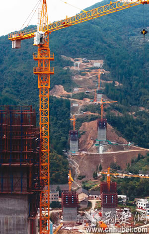 龍?zhí)逗犹卮髽蚓o鄰長(zhǎng)陽縣榔坪鎮(zhèn),是滬蓉西高速公路上一座T構(gòu)箱梁橋,主橋墩最高178米,居世界同類橋高墩之最!耙娺^這么高的塔吊沒?”戴上安全帽,湖北路橋公司項(xiàng)目經(jīng)理夏君華帶記者一行踏訪工地。