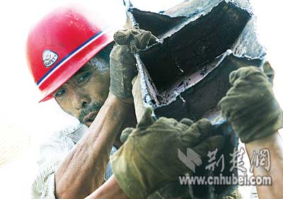 現(xiàn)場施工的8名農(nóng)民工都來自監(jiān)利縣。他們有的用焊槍切割船體,有的將割好的鋼板搬到岸上。每塊鋼板重約80公斤,兩個(gè)人抬著走,豆大的汗珠布滿黝黑的臉龐,隨著移動的腳步一滴滴滾落地上。