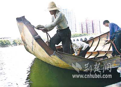 “船太大了,沒辦法運(yùn)出城,只好進(jìn)行分解后運(yùn)走。”負(fù)責(zé)現(xiàn)場施工的馬先生解釋,2002年初,他所在的公司承攬東湖清淤工程,共運(yùn)來8條清淤船,其中一條船放置在水果湖。當(dāng)時(shí),經(jīng)有關(guān)部門批準(zhǔn),這些船由大型車輛運(yùn)來并吊入湖中。目前清淤工程結(jié)束,湖中的船不好運(yùn)走,只好割成一塊塊鋼板,當(dāng)成廢鋼賣掉。