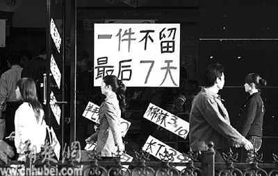 昨日,武漢市江漢路某品牌商店用碩大的“褲”字吸引行人購買欲(圖一)。在市場競爭激烈的今天,“臉面”設(shè)計成為商家費勁腦筋追逐的重心,但也有一些商家長期打著“大甩賣”的旗號欺騙消費者,頗煞風景(圖二)。記者 張鴻 攝