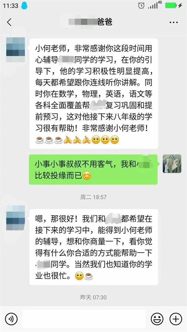 2021年的第一次線上志愿輔導(dǎo)在我的激動、欣喜、緊張交錯(cuò)之中開始了。第一步也是最重要的一步:和家長進(jìn)行交流與溝通。說實(shí)話,我的心里還是非常忐忑的:害怕家長不回復(fù)消息,害怕不能很好地了解小朋友的學(xué)習(xí)狀況。但其實(shí)邁出溝通的第一步之后,后面的對話就很自然了,并沒有想象中的那么困難和緊張。而且很幸運(yùn)的是,家長很配合我們的輔導(dǎo)活動,我的心里瞬間就放松了不少,自信心也莫名大增!被叫老師,真是很久違的感覺,令我成就感倍增,獲得了家長的稱贊也讓我很開心。而我本身也很喜歡數(shù)學(xué),希望我的興趣可以感染到小朋友,讓她也能喜歡數(shù)學(xué)。也希望通過基本的閱讀寫作教學(xué),讓她能夠提升自己。