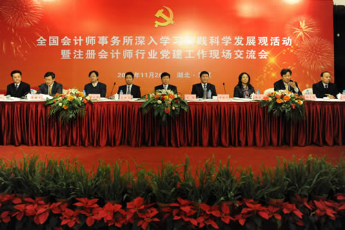 11月26日,財(cái)政部會(huì)計(jì)師事務(wù)所深入學(xué)習(xí)實(shí)踐科學(xué)發(fā)展觀活動(dòng)指導(dǎo)小組、中國(guó)注冊(cè)會(huì)計(jì)師行業(yè)黨委在湖北省武漢市召開全國(guó)會(huì)計(jì)師事務(wù)所深入學(xué)習(xí)實(shí)踐科學(xué)發(fā)展觀活動(dòng)暨注冊(cè)會(huì)計(jì)師行業(yè)黨建工作現(xiàn)場(chǎng)交流會(huì),深入學(xué)習(xí)貫徹黨的十七屆四中全會(huì)精神,總結(jié)各省市區(qū)會(huì)計(jì)師事務(wù)所學(xué)習(xí)實(shí)踐活動(dòng)和行業(yè)黨建工作做法,交流經(jīng)驗(yàn),探討方法,凝聚共識(shí),更加扎實(shí)有效地推進(jìn)會(huì)計(jì)師事務(wù)所學(xué)習(xí)實(shí)踐活動(dòng)和行業(yè)黨建工作。財(cái)政部黨組成員、副部長(zhǎng)、財(cái)政部會(huì)計(jì)師事務(wù)所深入學(xué)習(xí)實(shí)踐科學(xué)發(fā)展觀活動(dòng)指導(dǎo)小組副組長(zhǎng)、中國(guó)注冊(cè)會(huì)計(jì)師行業(yè)黨委書記王軍,湖北省委常委、常務(wù)副省長(zhǎng)李憲生出席會(huì)議并講話。