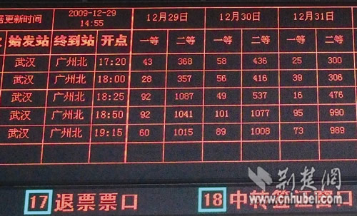 12月29日下午2時55分前后,記者在武漢站售票大廳看到,每10分鐘刷新一次的售票余額大屏幕顯示,?吭谡九_上即將于15時30分發(fā)車的G1045次列車,一等票剩111張、二等票剩716張,按照雙聯(lián)8節(jié)車廂、1200個座位計算,銷售車票350張左右,上座率三成左右。