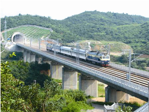 大瑤山位于湘粵交界之處,素有“南嶺險(xiǎn)關(guān)”之稱(chēng)。上世紀(jì)80年代,修建衡陽(yáng)到廣州復(fù)線,建設(shè)者用7年時(shí)間在這里修建隧道,全長(zhǎng)14公里,是當(dāng)時(shí)國(guó)內(nèi)最長(zhǎng)的雙線電氣化隧道。這次,武廣客專(zhuān)的方案是修建隧道群,由1號(hào)、2號(hào)、3號(hào)隧道組成,橋隧相連。3條隧道全長(zhǎng)25公里,用了3年半全部竣工。