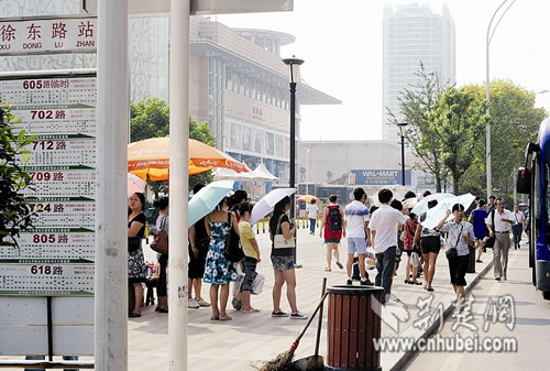 前日,江城最高氣溫突破37度酷暑線。中午12時,記者來到漢口火車站,公交候車區(qū)聚集了10多條公交路線。記者撐著傘在太陽底下站了不到10分鐘,已覺得皮膚火辣辣的。